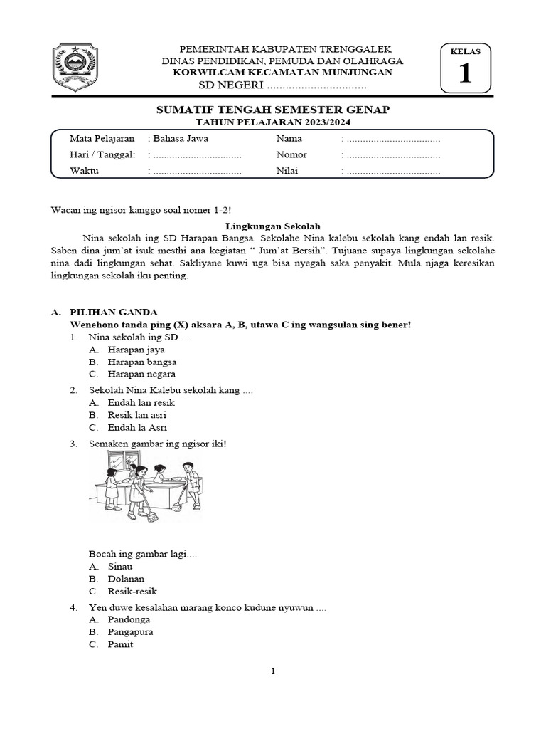 Penilaian Tengah Semester (PTS) merupakan momen krusial bagi siswa kelas 1 Sekolah Dasar untuk mengukur sejauh mana mereka telah memahami materi pembelajaran yang telah disampaikan selama separuh semester. Bagi mata pelajaran Bahasa Jawa, PTS menjadi tolok ukur kemampuan siswa dalam berbahasa, memahami budaya, dan berinteraksi menggunakan bahasa daerahnya. Mempersiapkan diri dengan baik adalah kunci keberhasilan. Artikel ini akan menyajikan panduan lengkap beserta contoh soal PTS Bahasa Jawa kelas 1 SD yang bervariasi, lengkap dengan penjelasannya, untuk membantu siswa, guru, maupun orang tua dalam proses belajar dan evaluasi.
