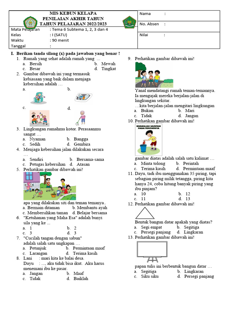 Format Soal yang Bervariasi: Soal untuk kelas 1 seharusnya tidak hanya pilihan ganda. Perhatikan apakah soal mencakup bentuk lain seperti menjodohkan, mengisi titik-titik, mengurutkan gambar, mewarnai, atau bahkan pertanyaan lisan sederhana yang bisa diadaptasi menjadi soal tertulis. Variasi ini penting untuk mengukur pemahaman anak dari berbagai sudut.
